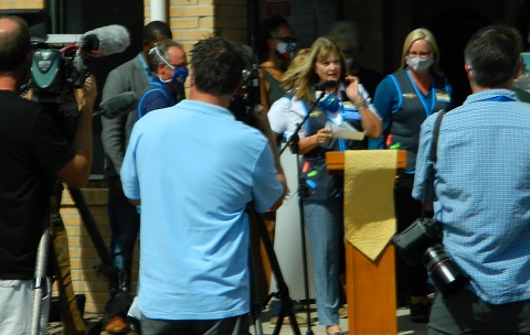 ABOVE: At left: Walmart delegation and local pastor. In center foreground: Lt. Gov. Lynn Rogers and Wichita Mayor Brandon Whipple. In center background: Wichita City Councilman Brandon Johnson. At podium: Senator Faust-Goudeau surrounded by members of Power CDC and the Dunbar restoration committee.
